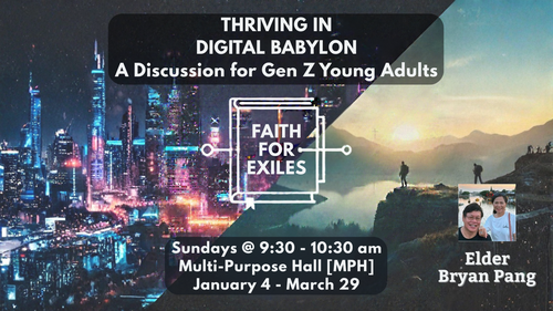 "In an era of endless scrolling and cultural polarization, how do we follow Jesus without losing our way? Join our new 12-week Sunday School series, Faith for Exiles, as we explore the five core practices that help young adults transition from 'digital fatigue' to a resilient, thriving faith. Each week, we’ll move beyond the screen to tackle the real stuff: navigating mental health, finding our vocational calling, and building an authentic, intergenerational community in a world that often feels like 'Digital Babylon.' Whether you’re looking for a safe place to ask hard questions or searching for a sense of purpose in a post-truth culture, this discussion-style class is for you. Come help us build a community that doesn't just survive the modern world, but changes it."This class will be led by Elder Bryan Pang and a few others and will be held in the Multipurpose Hall (MPH)